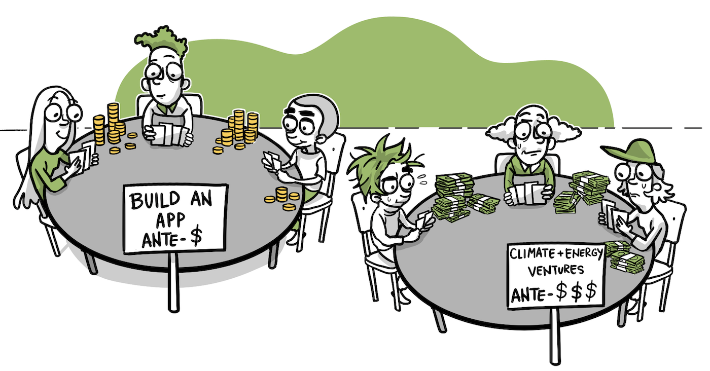 There are many reasons why, and we cover them extensively in the book, but it’s worth digging into one of the biggest ones. Climate and energy ventures require an extremely large amount of time and money to reach scale. Bill has a knack for coming up with pithy and insightful turns of phrase, and he dubbed this dynamic the “high price of poker.” There’s a certain cost to get started with a new venture, in terms of establishing basic technological viability and then eventually building and deploying a sellable product. This cost is like an ante in poker. For many software ventures, this ante is low, and AI is only making it lower. However, climate and energy ventures often seek to commercialize complex physical technology by building solutions at infrastructure scale, which ups the ante for them. Even the latest advances in AI can’t do much to lower it, because success depends on building large physical products and navigating slow-moving institutions. As a result, they need to make each move more thoughtfully and intentionally, including the decision of whether to play at all.