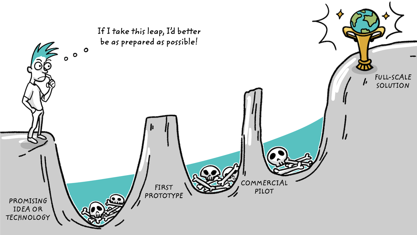 Another evocative image that’s often used to describe this situation is the valley of death, which is a metaphor for how promising technologies often fail to reach scale because they cannot overcome the challenges of financing and deployment. In practice, climate and energy ventures usually face multiple valleys of death because each stage of technology development and commercialization requires a step change in the amount of time, money, and customer traction necessary to proceed. Going back to our poker analogy, not only is the price of poker high but it gets higher each round, making it harder and harder to ante up. It’s also easier and easier to fold, hence the valleys of death.
